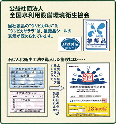 従来のグリストラップ清掃工法と比較すると、最大約50%のメンテナンスコストを削減できます。当社製品のグリピカロボ&グリピカサララは公益社団法人全国水利用設備環境衛生協会推奨品シールの表示が認められています。石けん化衛生工法を導入した施設には、水質及び細菌検査をクリアすることで、適合性の発行が受けられます。